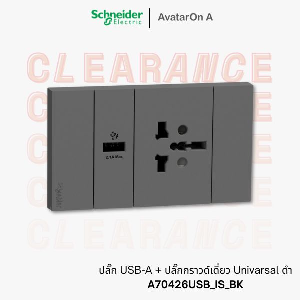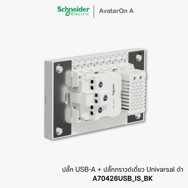 Schneider AvatarOn A ชุดประกอบสำเร็จพร้อมติดตั้ง ปลั๊ก USB-A + ปลั๊กกราวด์เดี่ยว Universal ดำ รหัส A70426USB_IS_BK