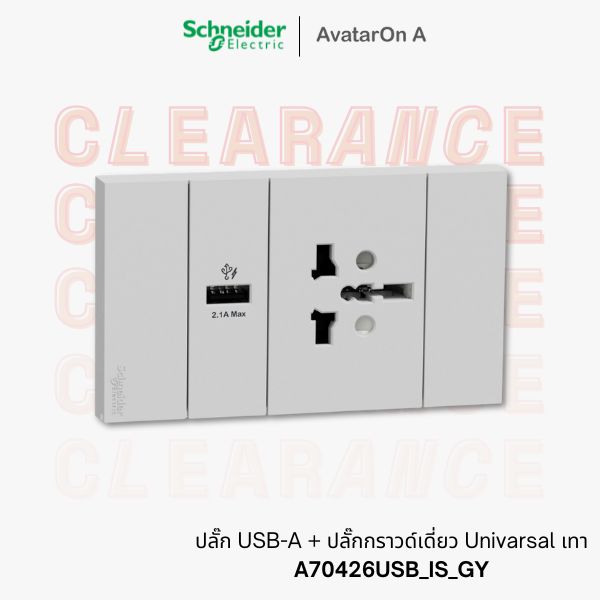 Schneider AvatarOn A ชุดประกอบสำเร็จพร้อมติดตั้ง ปลั๊ก USB-A + ปลั๊กกราวด์เดี่ยว Universal เทา รหัส A70426USB_IS_GY
