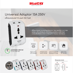 อะแดปเตอร์ปลั๊กไฟ ปลั๊กอเนกประสงค์ 13A 250V (Universal Adapter) จาก Haco Electric คือหัวแปลงปลั๊กไฟที่ออกแบบมาเพื่อรองรับการใช้งานกับปลั๊กไฟหลากหลายรูปแบบในตัวเดียว