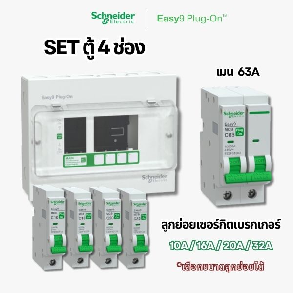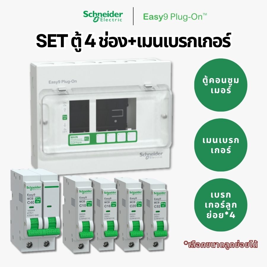 ชุดตู้คอนซูมเมอร์ยูนิต 4 ช่อง จาก Schneider Electric รุ่น Easy9 Plug-on ตอบโจทย์งานติดตั้งระบบไฟฟ้าบ้านพักอาศัยและอาคารขนาดเล็ก มาพร้อมเมนเบรกเกอร์และเซอร์กิตเบรกเกอร์ลูกย่อยครบชุด ออกแบบมาเพื่อความปลอดภัยและความสะดวกในการติดตั้ง ไม่ต้องซื้อแยก โดยภายในชุดมาพร้อมอุปกรณ์ป้องกันไฟฟ้าที่จำเป็นครบในกล่องเดียว ช่วยให้ติดตั้งได้ง่ายและใช้งานได้ทันที